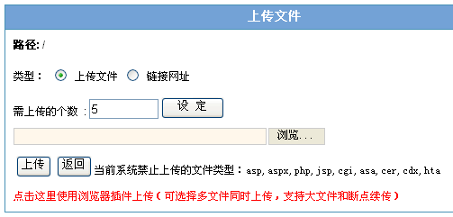 三、上传文件及链接 进入空间后在页面中点击“上传文件”图标,显示以下页面: 类型:上传文件: 此处可以指定要上传的文件个数,输入个数后点“设定”,即可重新显示多个上传框,选择本地要上传的文件后点“上传”,出现上传对话框,请耐心等待上传完毕。 如果点击了下面的红字使用浏览器插件上传,则要按页面中的提示装好Activex插件,然后点击“选择多个文件”,此插件可以同时选择上传多个文件,且具有断点续传功能,如下图: